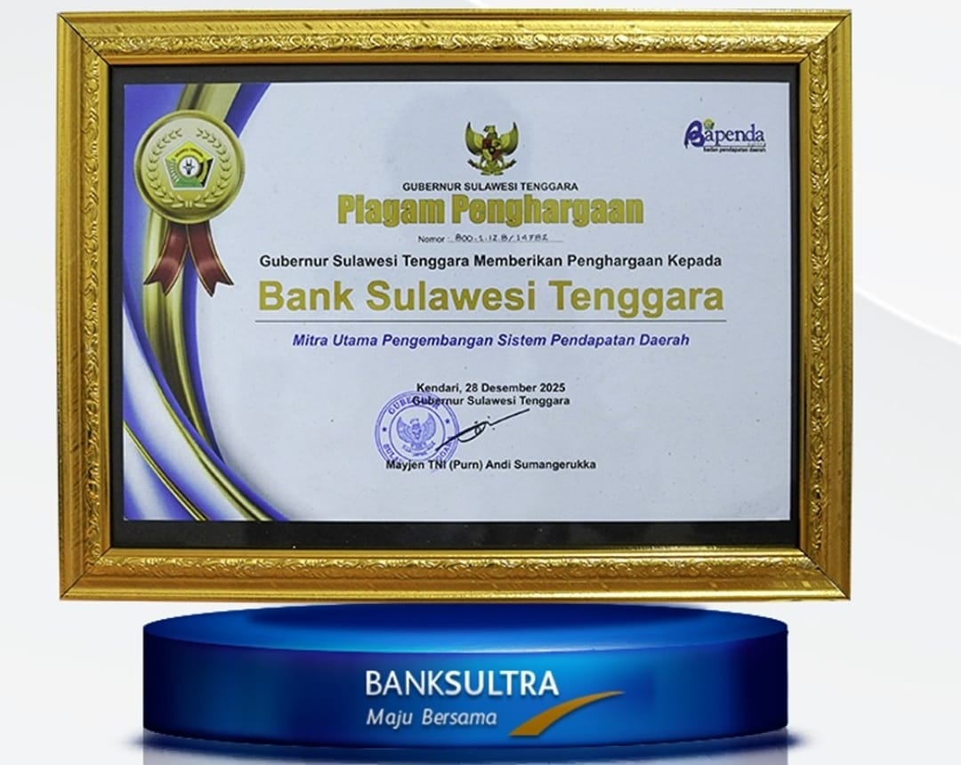 Penghargaan ini diserahkan langsung oleh Gubernur Sulawesi Tenggara, Andi Sumangerukka, dan diterima secara simbolis oleh Direktur Kepatuhan Bank Sultra, Taufik Akbar.