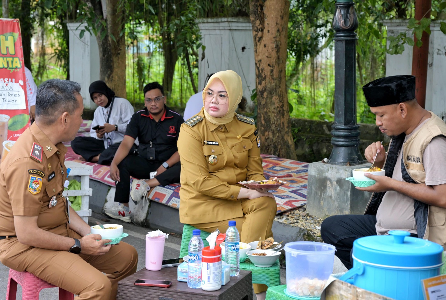 Wakil Wali Kota Sudirman terlihat menikmati hidangan sambil sesekali menyapa warga sekitar, sementara Sekda Amir Hasan terlibat dalam obrolan ringan yang mengalir tanpa sekat. Suasana berlangsung sederhana, namun penuh kehangatan.
