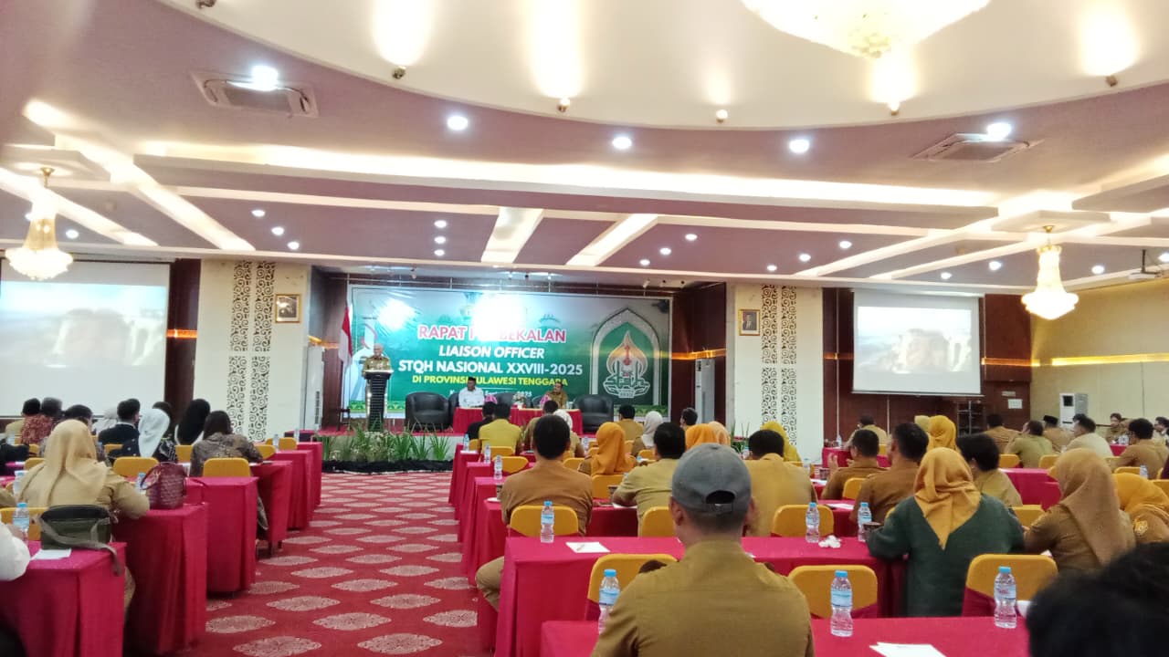 TERAMEDIA.ID,KOTA KENDARI – Sekretaris Daerah Provinsi Sulawesi Tenggara, Drs. Asrun Lio, M.Hum., Ph.D., secara resmi membuka Rapat Pembekalan Liaison Officer (LO) Seleksi Tilawatil Qur’an dan Hadis (STQH) Nasional XXXVIII Tahun 2025 yang digelar pada 28–30 September di Kendari. Kegiatan ini menjadi tahap penting dalam mempersiapkan Sultra sebagai tuan rumah penyelenggaraan STQH yang puncaknya akan berlangsung pada 11 Oktober mendatang.