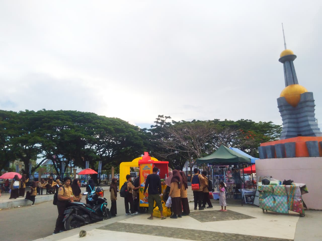 Tak hanya meramaikan acara, kedatangan pelajar bersama guru dan beberapa orang tua juga dimanfaatkan untuk membeli jajanan, mencoba berbagai permainan, dan menikmati suasana sore di Tugu MTQ. Area ini mulai dipenuhi pengunjung menjelang malam, dengan tambahan kegiatan pengajian dan penampilan qasidah yang semakin memeriahkan suasana.