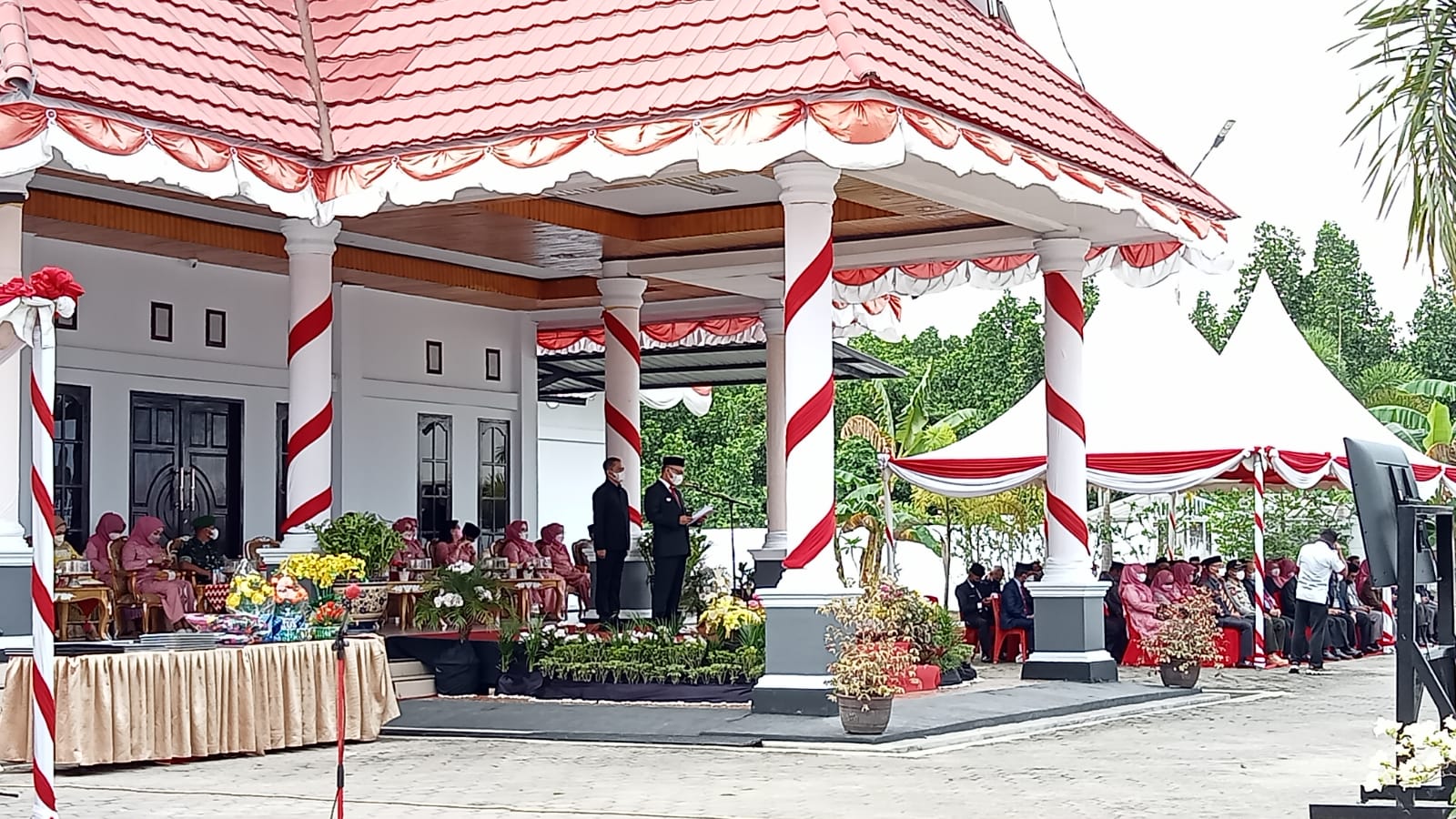 Prosesi Upacara pimpin oleh Wali Kota Kendari Sulkarnain Kadir dengan tetap menerapkan disiplin protokol kesehatan.