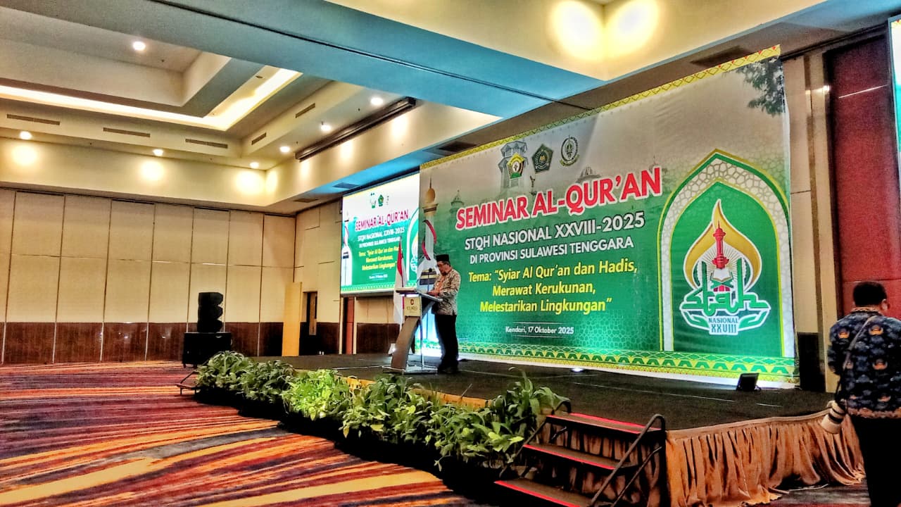 TERAMEDIA.ID, KENDARI – Wakil Gubernur Sulawesi Tenggara, Ir. Hugua, menegaskan pentingnya menjadikan Al-Qur’an bukan hanya sebagai bacaan dan hafalan, tetapi juga sebagai pedoman hidup yang menginspirasi tindakan nyata dalam membangun peradaban manusia yang berakhlak dan berkelanjutan. Hal itu disampaikan saat membuka Seminar Al-Qur’an dalam rangka STQH Nasional XXVIII Tahun 2025, yang digelar di Hotel Claro Kendari, Jumat (17/10).