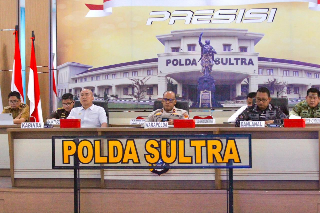 Rapat koordinasi ini turut dihadiri unsur Forkopimda Sulawesi Tenggara, Pejabat Utama Polda Sultra, para Kapolres jajaran, serta perwakilan TNI dan instansi terkait lainnya.